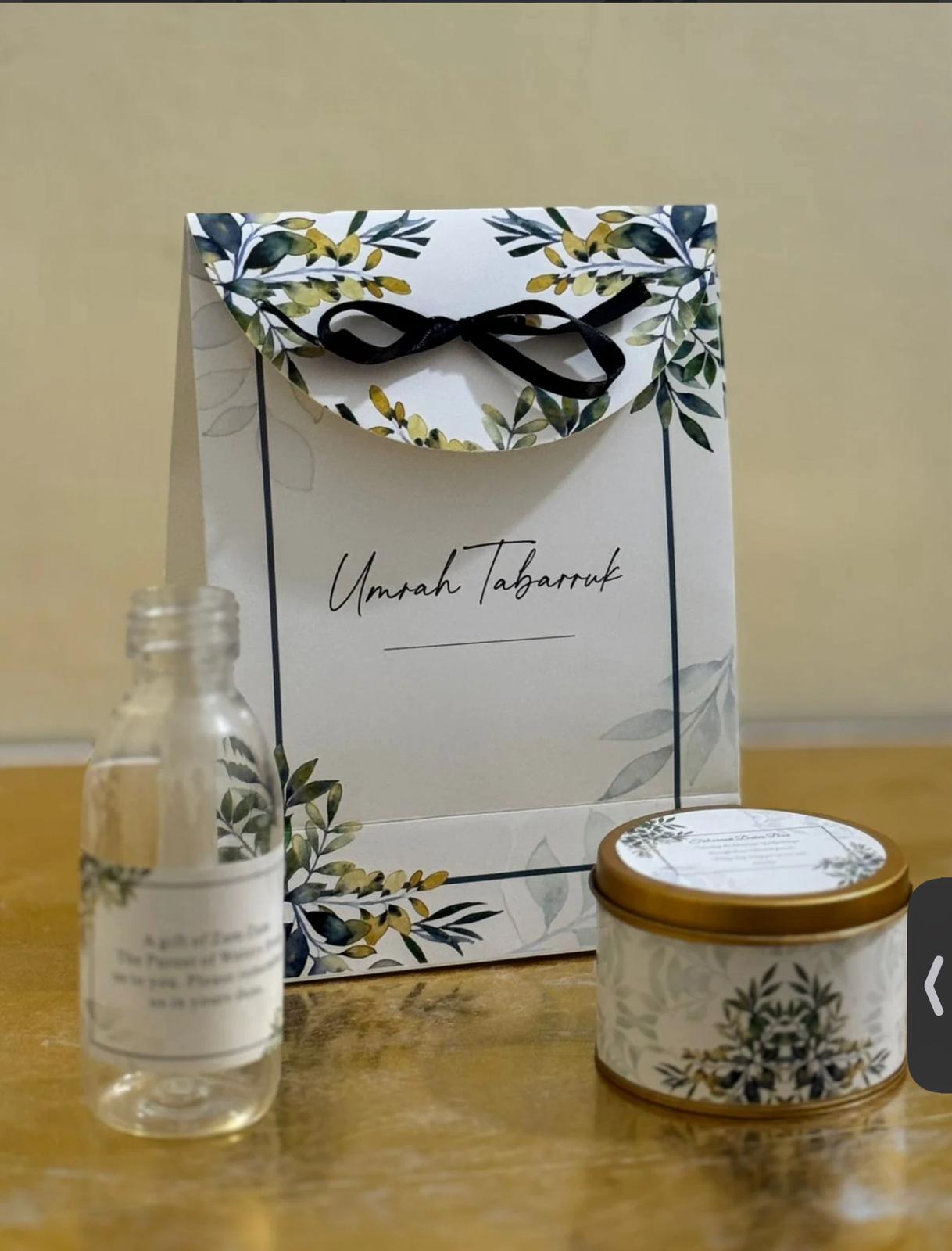 ๐ Buy Hajj and Umrah Tabarruk Gift Sets in Pakistan โ Custom Islamic Packaging for Dates, Zamzam, Tasbeeh & Attar - All in one elegant package.