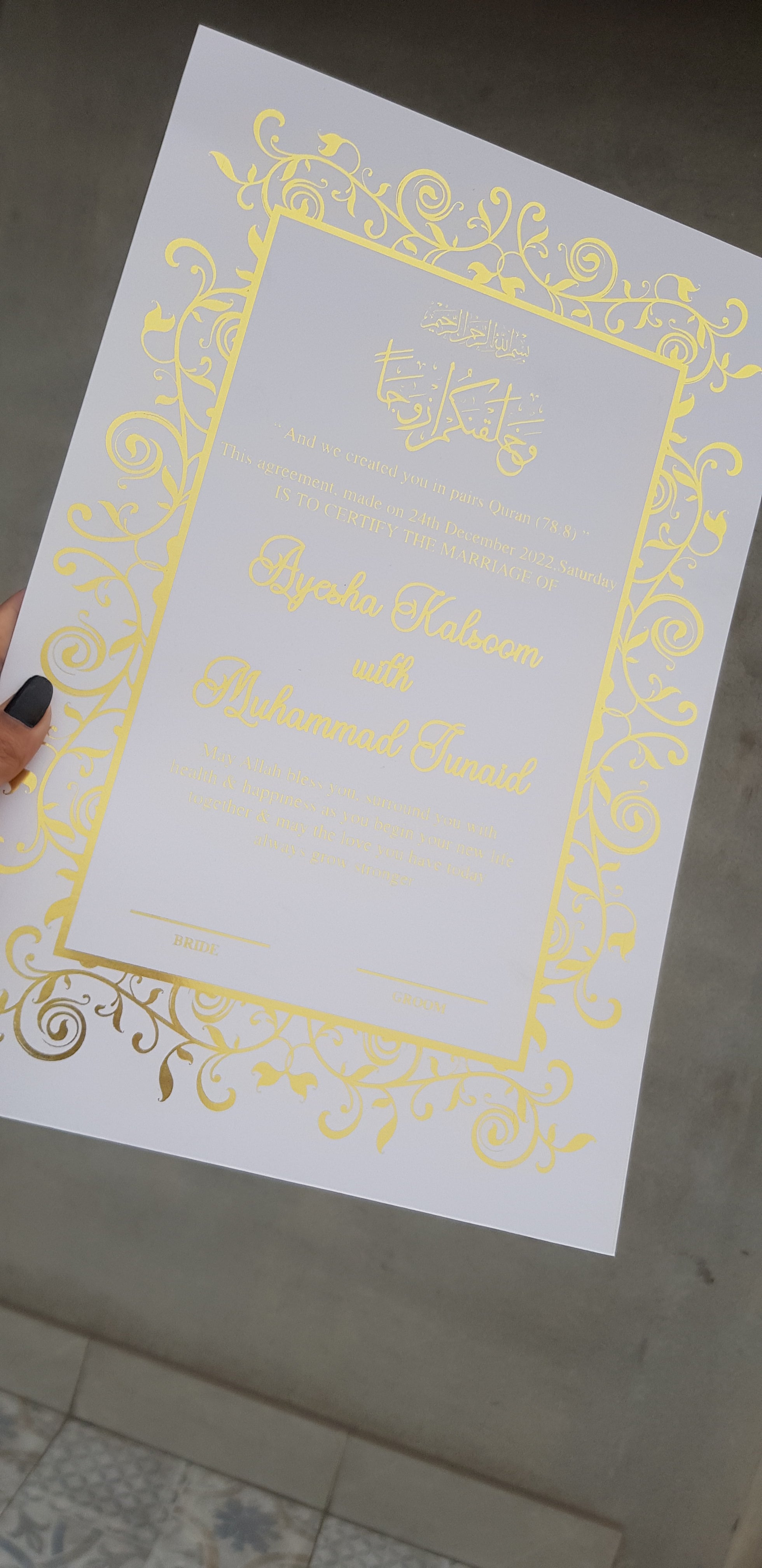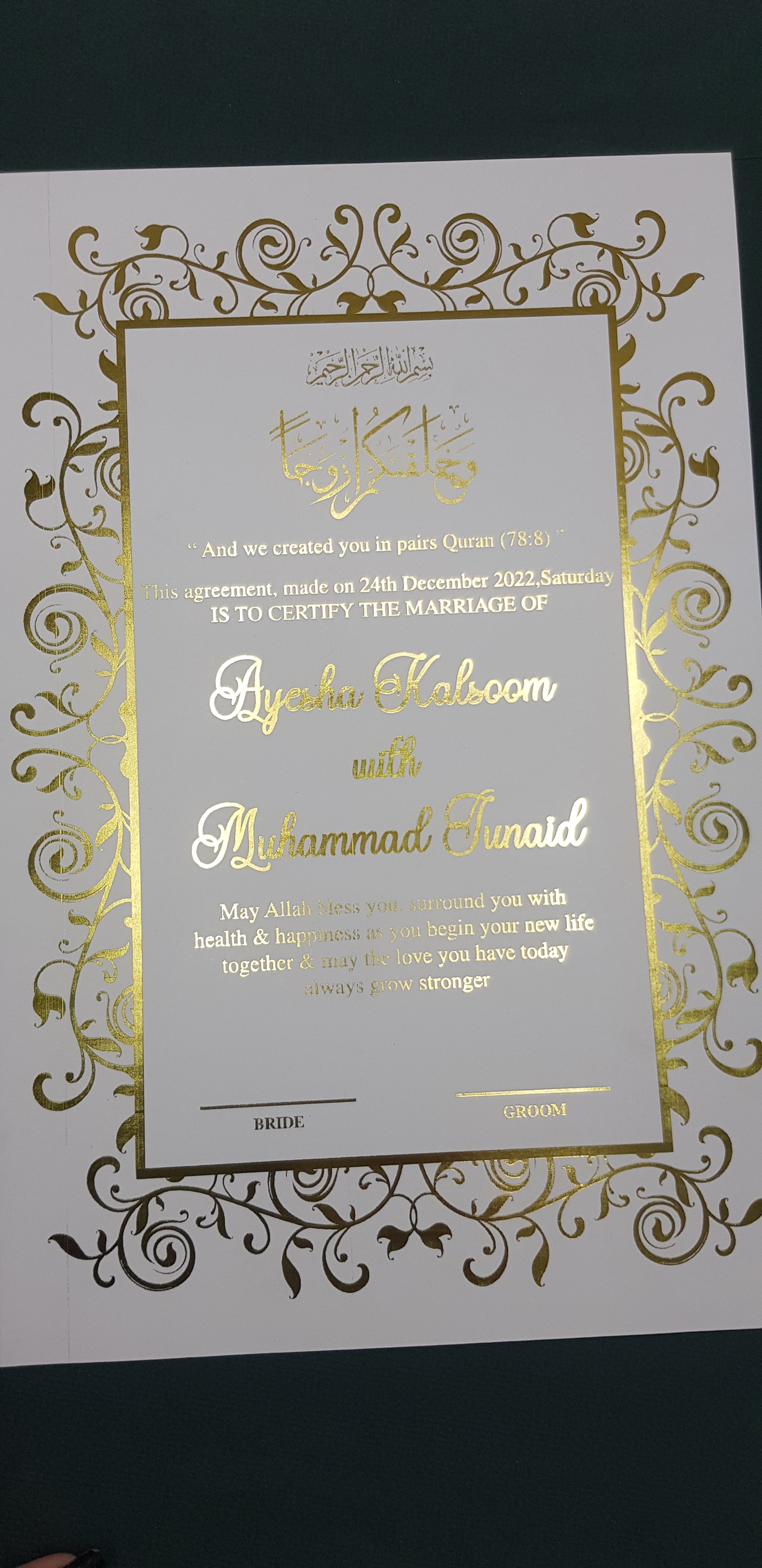 βœ… Free Personalization – Add bride & groom names, wedding date, venue & Quranic verses (Nikah Nama per naam likhwa sakte hain)