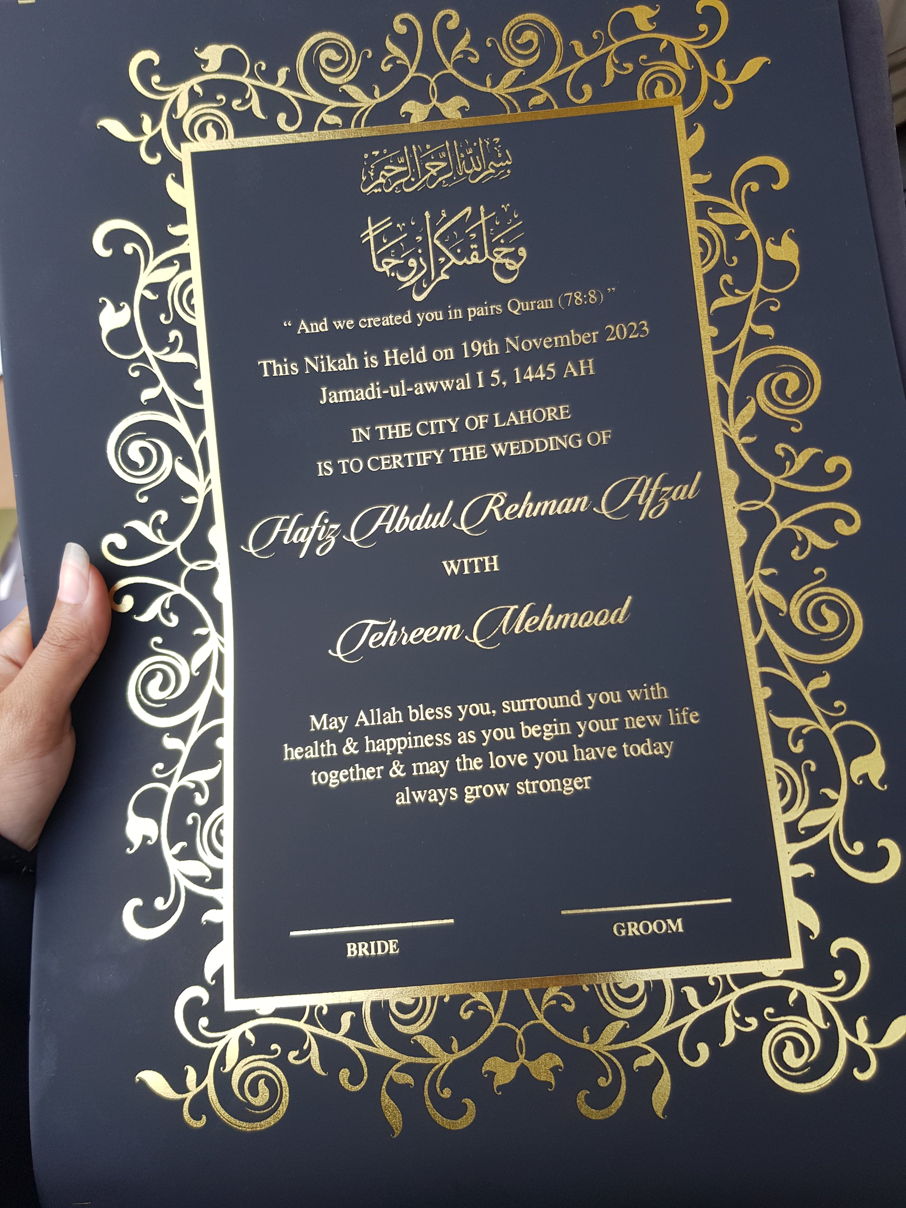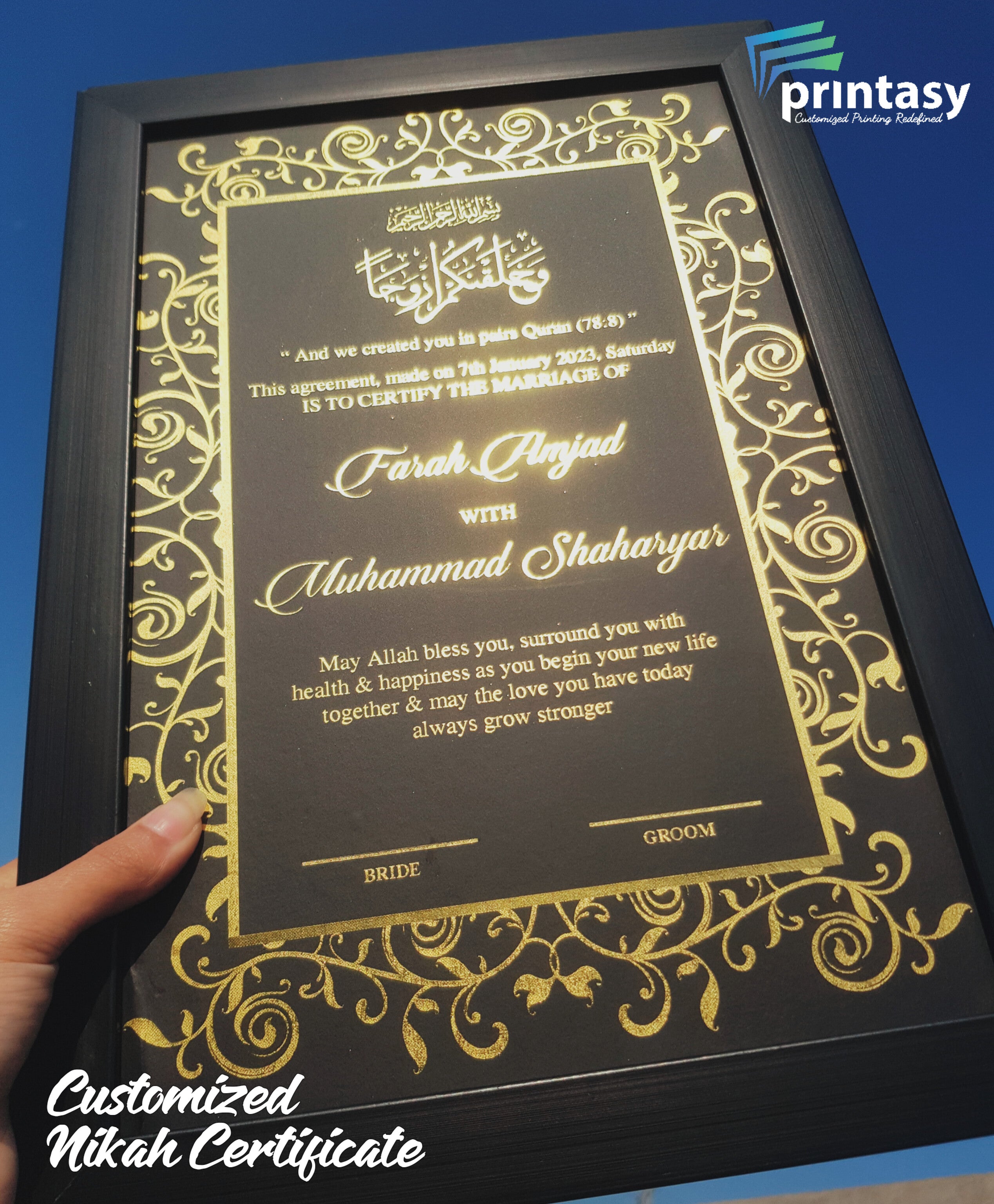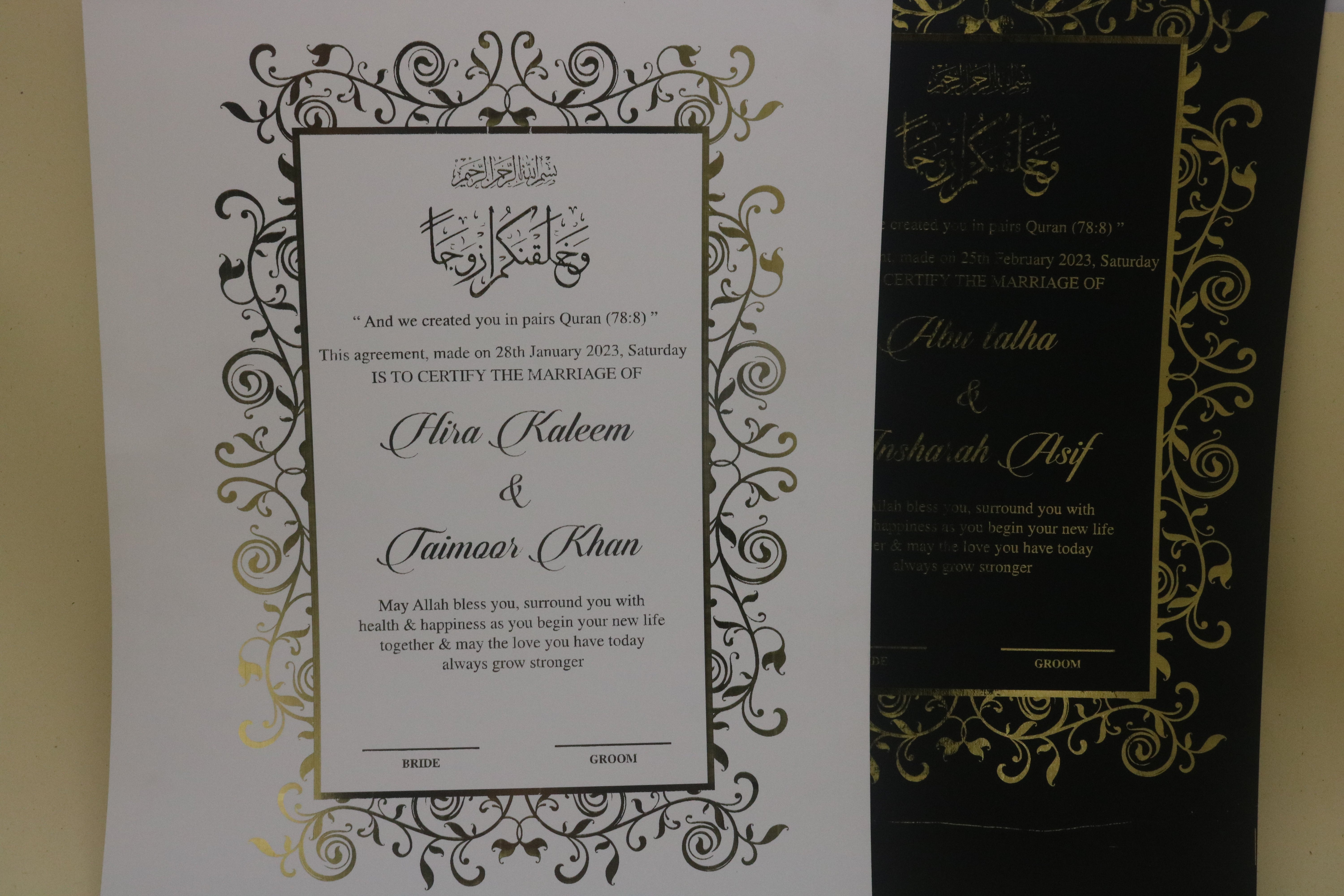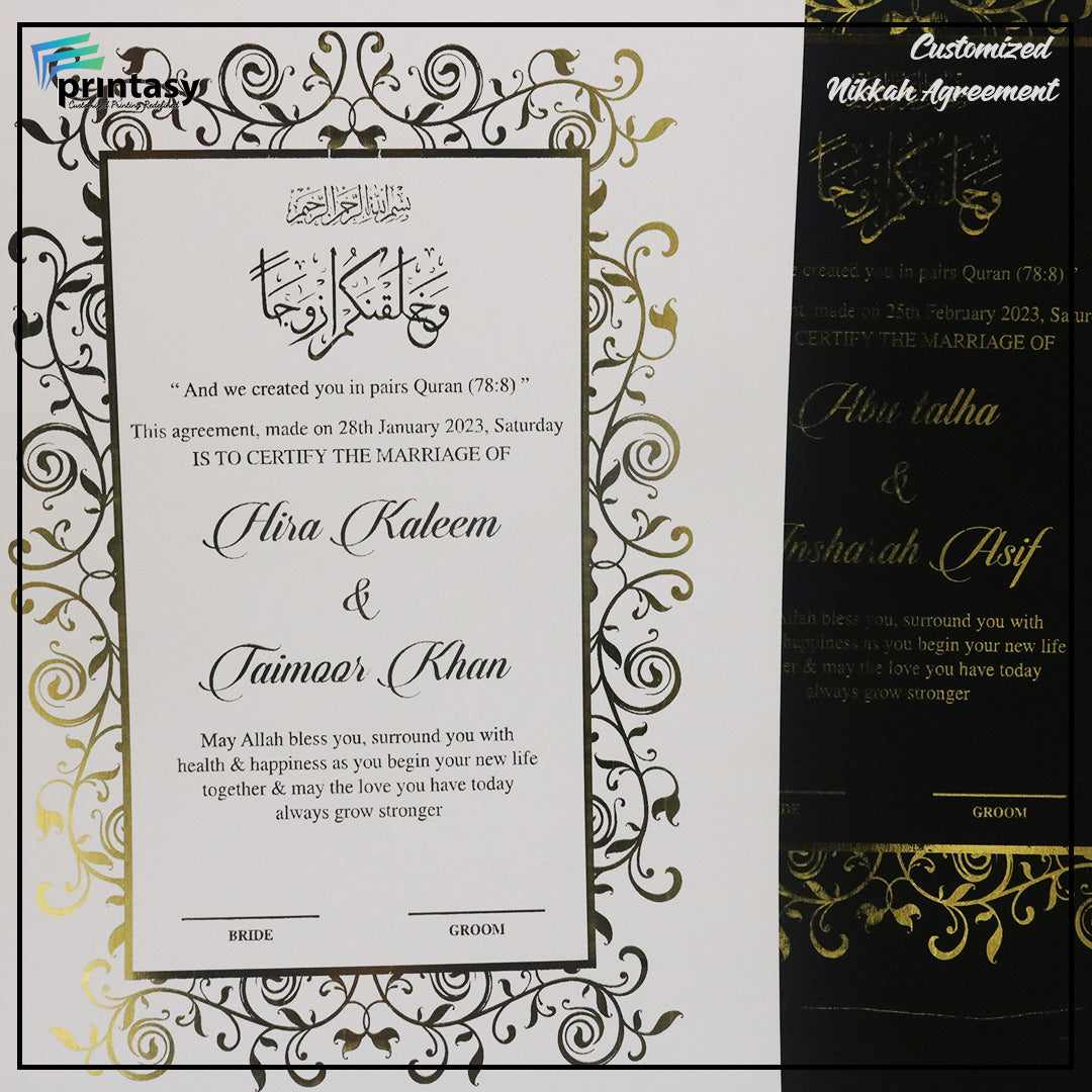 Make your Nikkah day unforgettable with our luxury customized Nikkah certificates in Pakistan and beautifully designed personalized Nikah Nama – crafted to match your wedding theme and preserve your special moments forever.