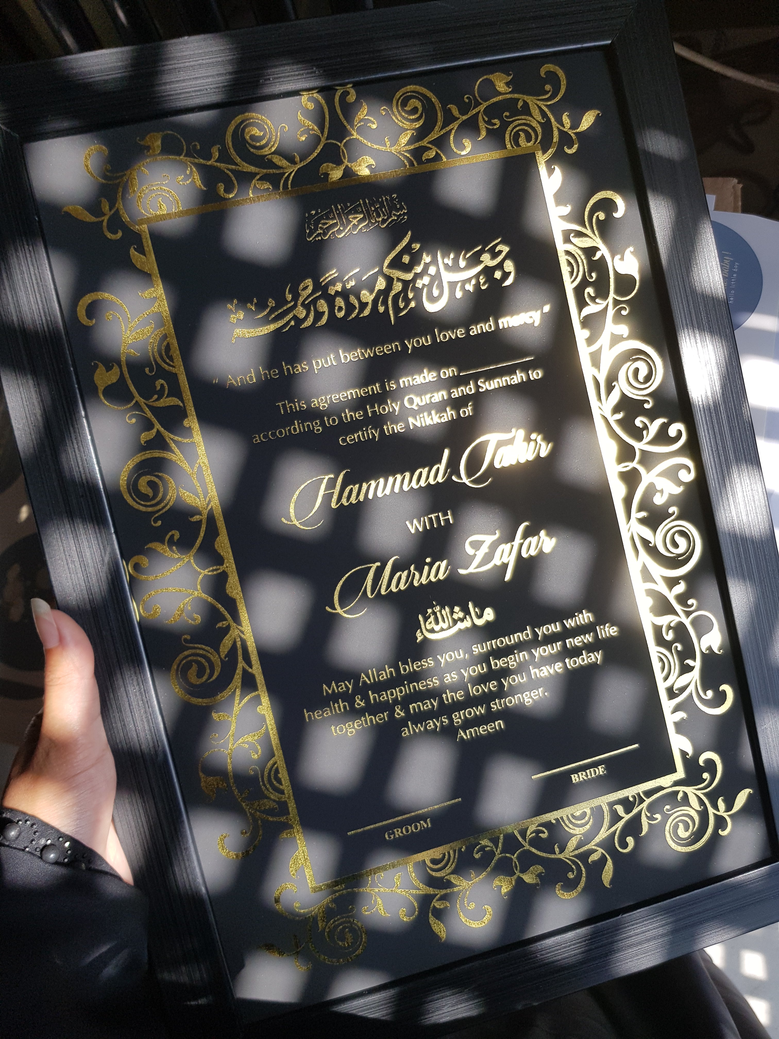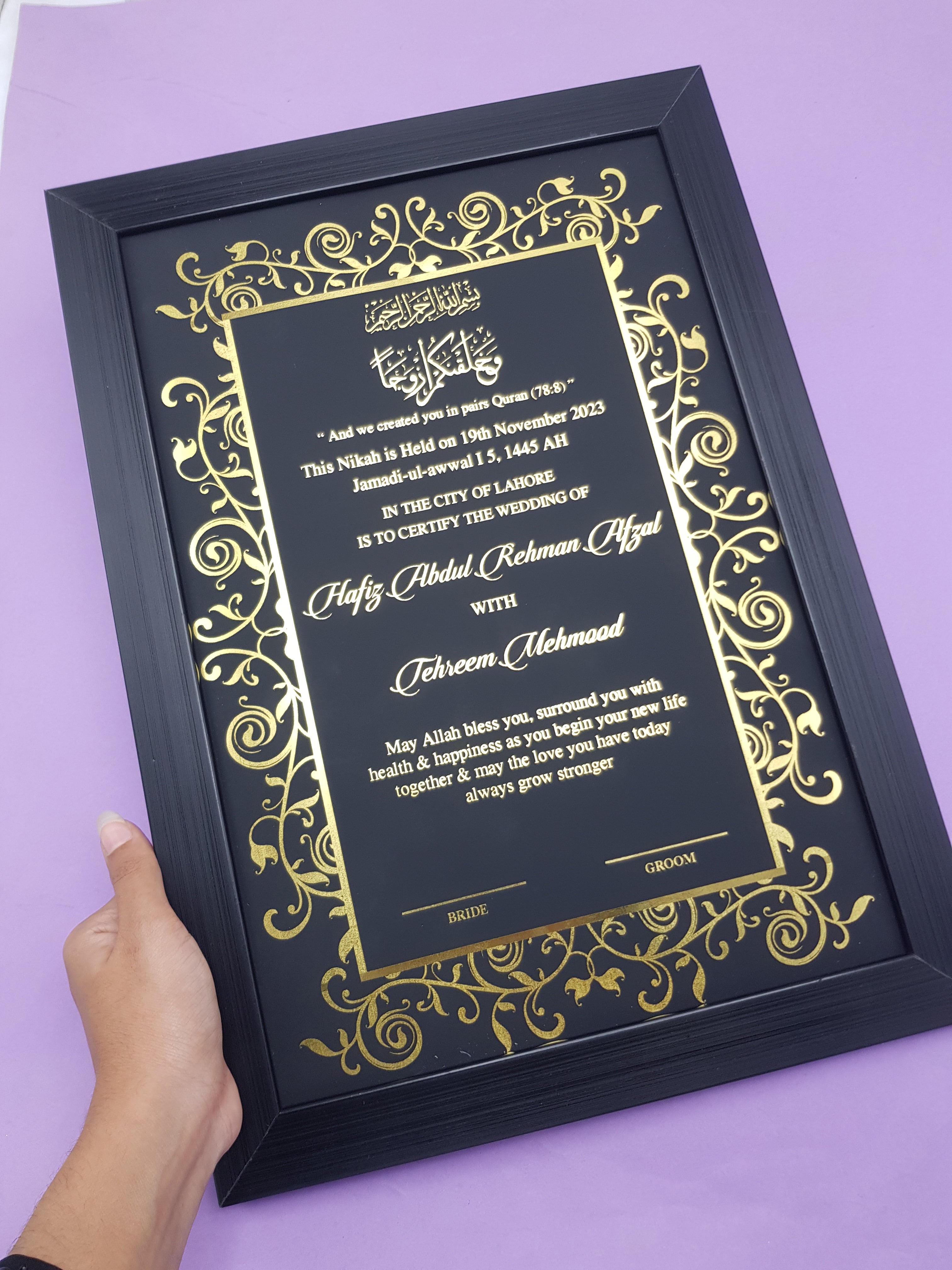 βœ… Optional Elegant Frame – Black or Gold finish for a classy display (gold frame nikah certificate)